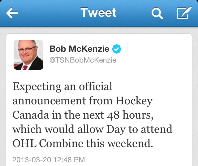 McKenzie owns a nearly flawless track record of providing accurate factual information via twitter so it appears Sean Day will join John Tavares, Aaron Ekblad and Connor McDavid as the only three players to receive “exceptional status”.