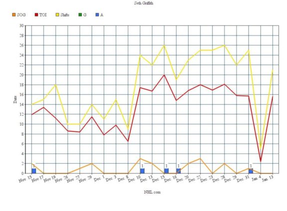Beginning Dec. 10, 2016, two weeks after Gallant’s departure, Griffith’s ice time sky-rocketed. That’s also when he started getting more shots on goal. Although he wasn’t able to turn these opportunities into actual goals, he started to get assists more regularly.