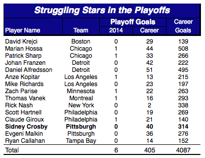 The problem is that Crosby has zero goals in the playoffs. Kane, Toews and Getzlaf have three apiece.