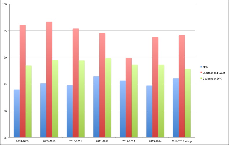 Here you’ll see a graph depicting the Year-To-Date shorthanded Corsi Against per 60 minutes for the Wings in addition to their Year-To-Date Penalty Kill% .