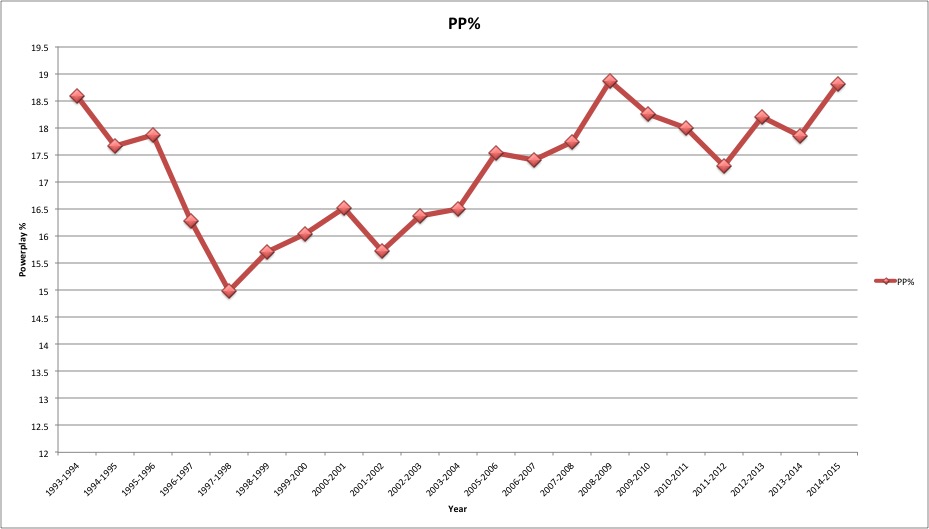 From this you can see that the Wings are performing right now on par with your average top-10 penalty killing team from the past six years. However, this has required Howard to play well above his career average and for the Wings to limit their shorthanded CA60 at an incredible rate. The other thing to consider is that the powerplays in the NHL are operating at a phenomenal percentage. The Pittsburgh Penguins lead the NHL with a 31.6% conversion rate. No team has topped 30% for a season since 1978-1979 when the New York Islanders operated at a 31.2% rate. The NHL record is 31.9% held by the 1977-1978 Montreal Canadiens. In addition to the Penguins operating at a historic clip, the league average for PP% is also dramatically up. Take a look at this graph showing the average PP% over the last 20 years.