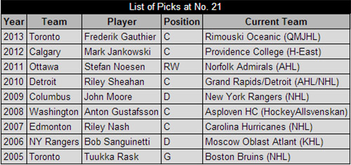 Historically, the 21st pick has produced some NHL talent, as well as some high-end AHL property. You can see that the talent range can vary from year to year.