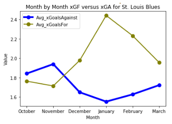 One hypothesis on why this team was so bad at the beginning of the season, is simply that they were not used to playing together. The chart below uses data from moneypuck.com and displays the Blues’ month-to-month Expected Goals For (xGF) and Expected Goals Against (xGA), which again takes into account shots, shot selection, and shot distance to project how many goals a team should be scoring.