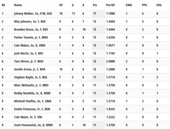 Still, Perunovich has a number of factors going against him, (as evidenced in the above graphic from uscho.com.) including the fact that he’s neck and neck with Cale Makar, a top prospect in the Avalanche system, and Bobby Nardella for the points lead amongst defenseman. He will need to outrace both Makar and Nardella and keep himself at the very top of the scoring list to actually bring home the Hobey Baker Award. But whether he wins it or not, Perunovich has a bright future in hockey.