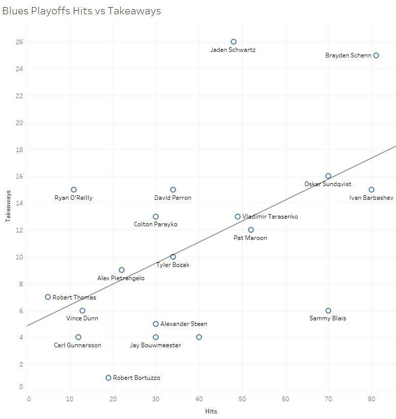 The Blues were very functionally physical, meaning that their physicality actually led to them getting possession of the puck. Below you can see the Blues’ players charted by hits versus takeaways during the playoffs using data from Natural Stat Trick.
