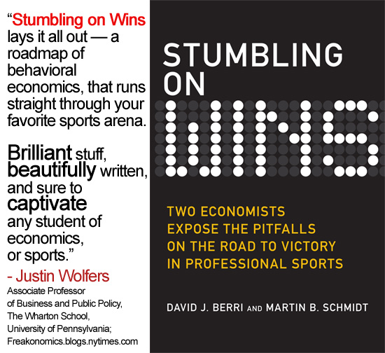 Back to the task at hand – Stumbling On Wins is yet another intriguing entry in the realm of sports statistical analysis, as well as sports behavioural economics. Admittedly, I did not agree with several of the conclusions drawn by the authors, especially pertaining to hockey. However, I was in fact pleasantly surprised to see the NHL referred to at all in a sports economics book that also reviewed subject matter from all of the major North American sports. As well, I think the authors accomplished much of what they set out to do – generate thought-provoking concepts for the thinking sports fan.