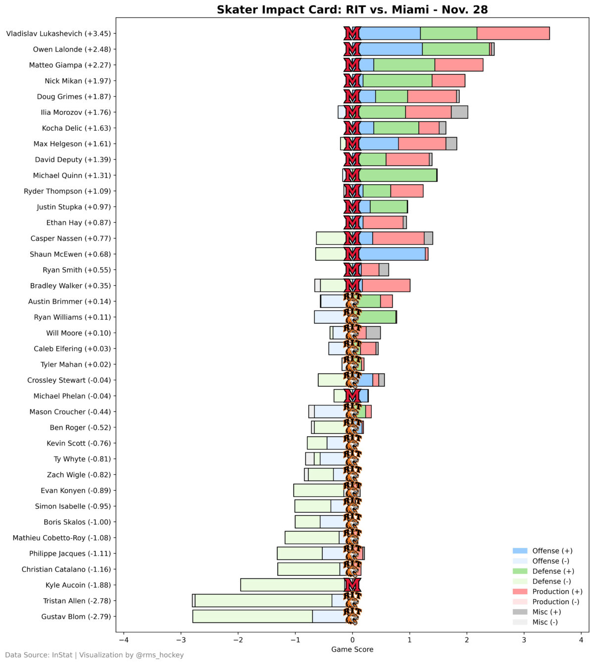 The line of Mikan, Hay, and Walker had its best game of the season and spent a good portion of the night matched up against the RIT top line, handling those shifts well. Mikan also finished plus-1.97 in the scorecard above.