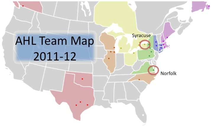 Some, including the Times, suggest that as the most southerly franchise in the AHL’s Eastern Conference, high travel costs may be one of the reasons why the Lightning may have gone shopping for a new developmental partner. Admirals GM (and Lightning Assistant GM) Julien BriseBois has said that “our relationship with [Norfolk’s] ownership, the arena, fan support have all been great. Our only issue is that Norfolk is so geographically removed from the rest of the league.”