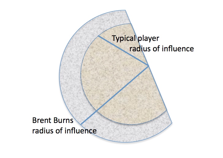 I’ll take a couple of paragraphs to describe two critical but rarely discussed aspect of Burns’ game. I consider Burns to be a ‘big radius’ player. When I think of a player and the area he impacts, I think of it as a semi-circle. He influences the play where he is standing, but also approximately 90 degrees to the right and to the left. The area influenced is a function of the radius squared. A player with a six-foot radius will impact an area 44% greater than a player with a five-foot radius.