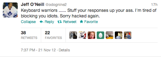 Empty threats you say? Well, maybe Jeff O’Neill has won the inappropriate comment award previously belonging to Chris Chelios. Threatening the safety of Bettman’s family? Low blow. Making a pun out of the “make whole” angle of negotiations? Also, not the best idea.