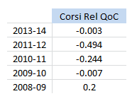 (Corsi Relative Quality of Competition compares 5v5 Even Strength all shots attempted versus shots against when a player is on the ice, relative to teammates and opposition.)
