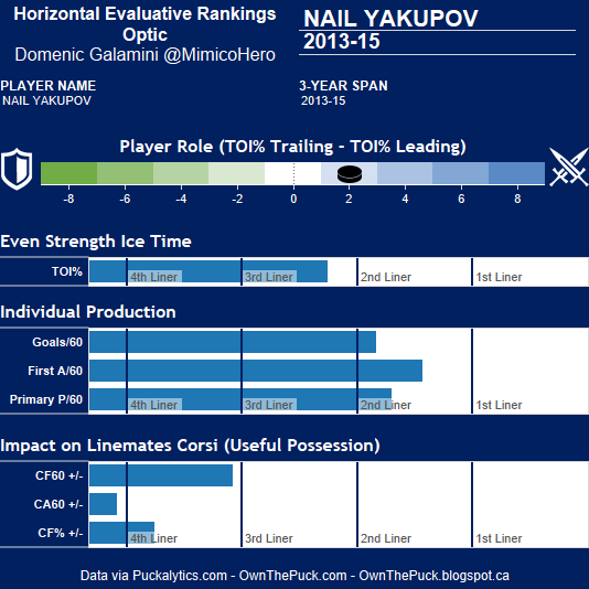 If we look at the Hero Chart, it becomes clear that Yakupov’s reputation as a terrible defensive player is accurate. One thing that does look good, however, is that he has outscored his ice-time by a good margin.