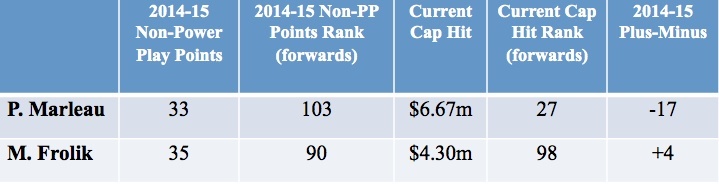 A quick glance at last season’s results show that Marleau is putting up numbers that are similar to Michael Frolik. This season, it is more of the same. Frolik has nine even-strength points and is minus-1; Marleau has seven even-strength points and is minus-3. Frolik is 178th in cap hit among all players, 98th among NHL forwards. His cap hit is over $2.3 million less than Marleau’s. While I choose Frolik for this comparison, there were many player comparisons that I could have selected to tell the same story.