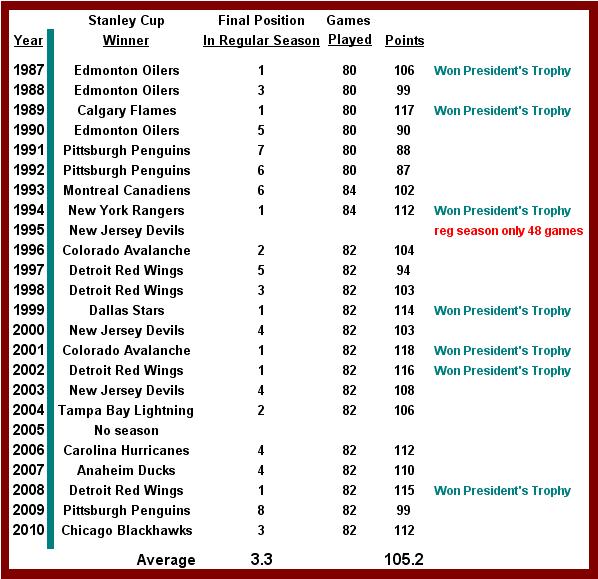 Since the playoffs were expanded in 1987 to four best-of-seven series, no team seeded 9th or lower has gone on to win the Holy Grail of hockey. The one exception was the lockout-shortened 1994-95 season when the 9th seeded New Jersey Devils went on to win a Cup championship. In presenting my case, that season doesn’t count. They only played 48 regular season games that year.