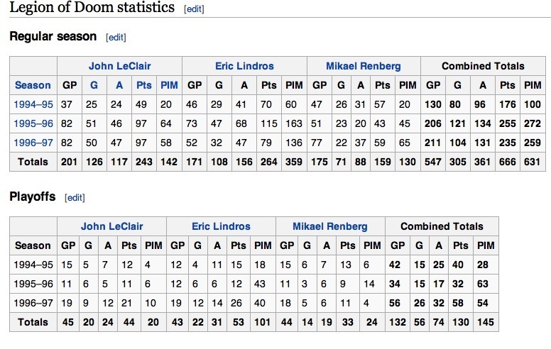 Up front you could almost put together about four teams with four lines apiece with all of the magnificent players that have skated for Philly over the past two decades. Out of all of those players none can come close (in my mind) to the game-changing trio that was known as the Legion of Doom line: Mikael Renberg-Eric Lindros-John LeClair.