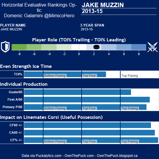 Muzzin, in the last three seasons, has a CF% of 60.21% which, to put it in perspective, the second best player (Doughty), has a 57.23% , but the range of Corsi is, at it’s most extreme, only 40-60% and therefore to be 3% higher than the second best player is massive. Also, only 12 defensemen in the NHL have a 55% or higher for the last three years.