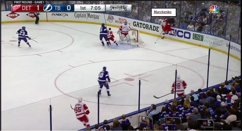 In this image, you can see that Red Wings’ defenseman Alexey Marchenko has time to setup, but that Tampa is aggressively forechecking with three forwards deep in the zone. This play is an opportunity for the Wings to catch the Tampa forwards deep and create an odd-man scoring chance. Instead, you can see that Marchenko’s already made up his mind and he ends up throwing this puck off the boards towards the near side. The play results in a near turnover and the Wings end up having to throw the puck out of the zone.