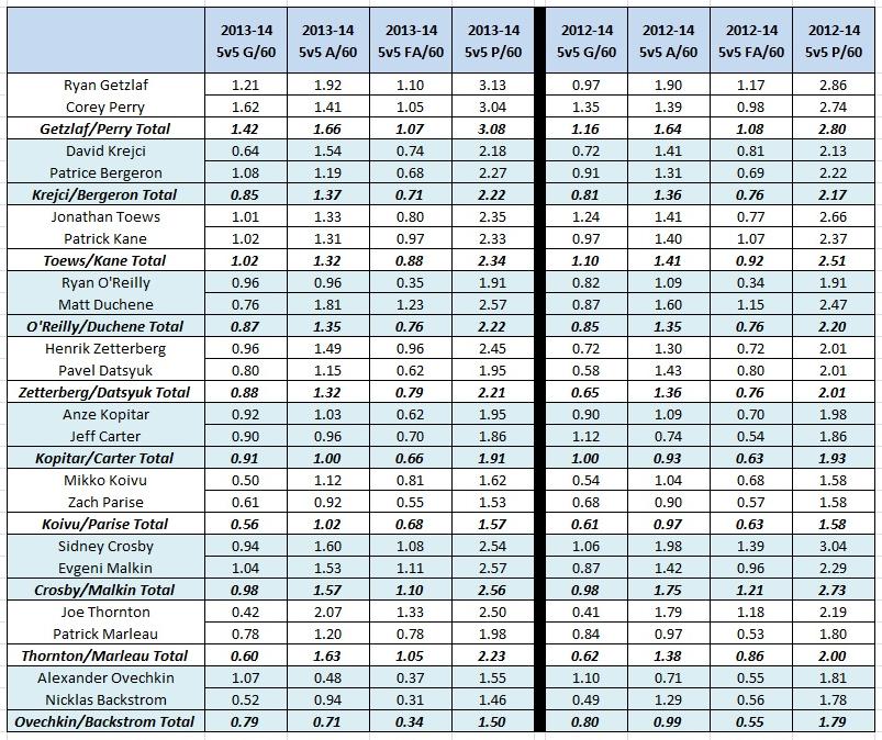 Getzlaf-Perry fly together here, individually ranking third and fourth in 5v5 Points/60 from 2012-14 (over 1500 mins). You won’t be shocked by who’s on first.