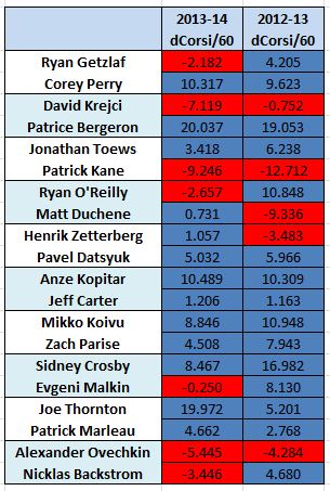 dCorsi shortchanges Kane and Ovechkin. In 2013-14, Bergeron and Thornton’s figures led the league; in 2012-13, Bergeron was third and Crosby fifth.