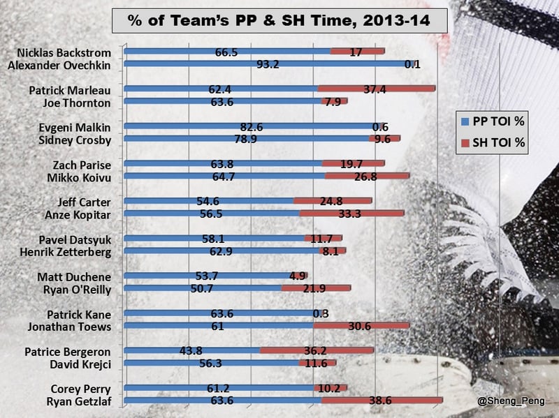 Saying that Ovechkin-Backstrom made up for their 5v5 shortfall on the power play is an understatement. From 2012-14, Backstrom paced the league in 5v4 Points/60 (over 300 mins) by nearly a point (8.11); Giroux (7.14), Ovechkin (6.6), Zetterberg (6.44), and Malkin (6.4) round out the leaderboard, while Crosby (6.08) and Kane (5.68) also make the top 10.