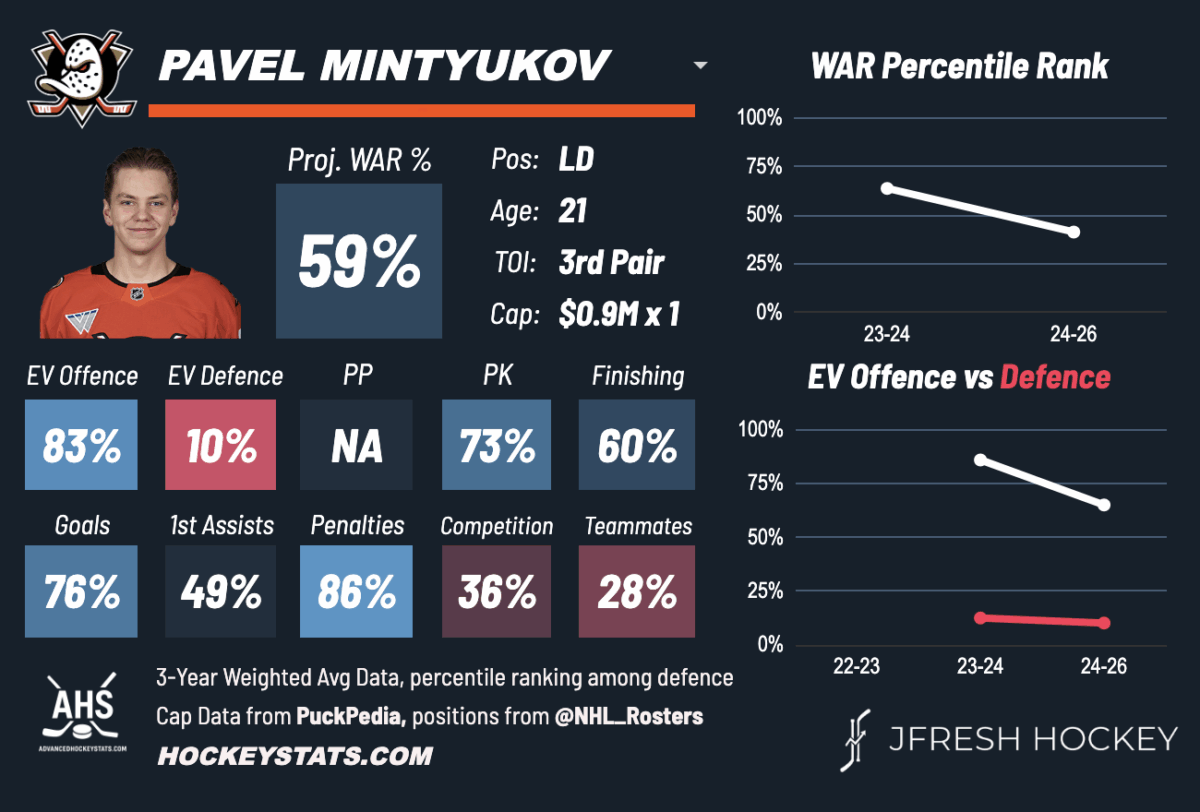 Olen Zellweger is also a pending RFA, so one could be available. Mintyukov would fit like a glove on the right side. He’s been a mainstay on the Ducks’ back end and has notched 20+ points in his first two seasons. He has clear offensive upside, but needs some work on his defensive game, and maybe a new system would help.