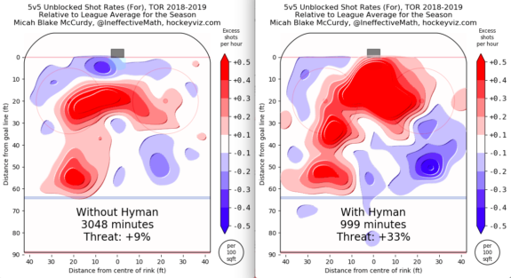 Thanks to Micah Blake McCurdy’s shot maps at HockeyViz.com, we can see that with Hyman on the ice at 5-on-5 this season, the Maple Leafs’ offensive threat level (measured in unblocked shots for) increases significantly.