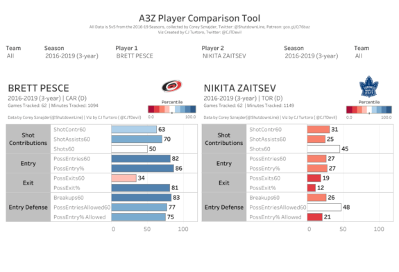 Pesce’s zone exit numbers are not great, but he sits in the 83rd percentile in breakups per-60 minutes over the last three seasons. He’s also surprisingly good at helping his team enter the offensive zone often, and with possession. Zaitsev, meanwhile, is ugly in all areas.