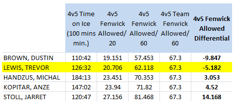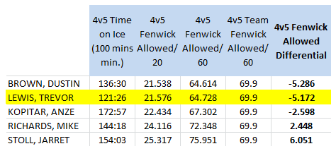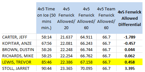 Every season except for last, Lewis has been the team’s best or second-best forward in 4v5 Fenwick Allowed differential (Brown has posted a ridiculous 91.902 4v5 FA60 in just 37:52 4v5 TOI this year). Let’s not forget that 2012-13 was a much smaller sample size because of the lockout.