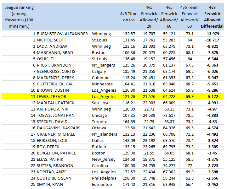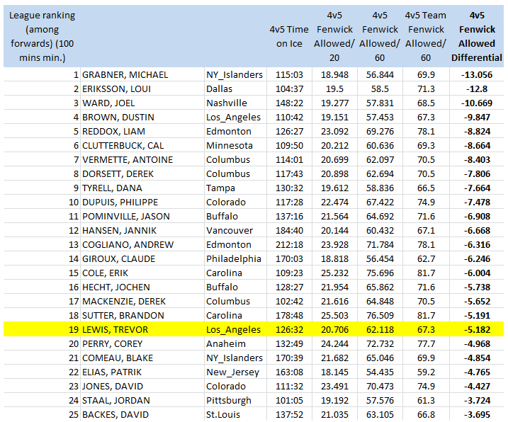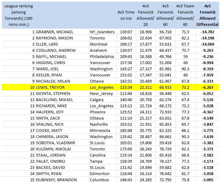 From 2010-14 (counting 2013-14 as complete), Lewis is among four forwards (Grabner, Cogliano, Sutter) who have three top-25 finishes in 4v5 Fenwick Allowed differential and among six forwards (Grabner, Cogliano, Ward, Prust, Clutterbuck) with two top-15 finishes. While not an elite penalty killer like Grabner, he’s very good.
