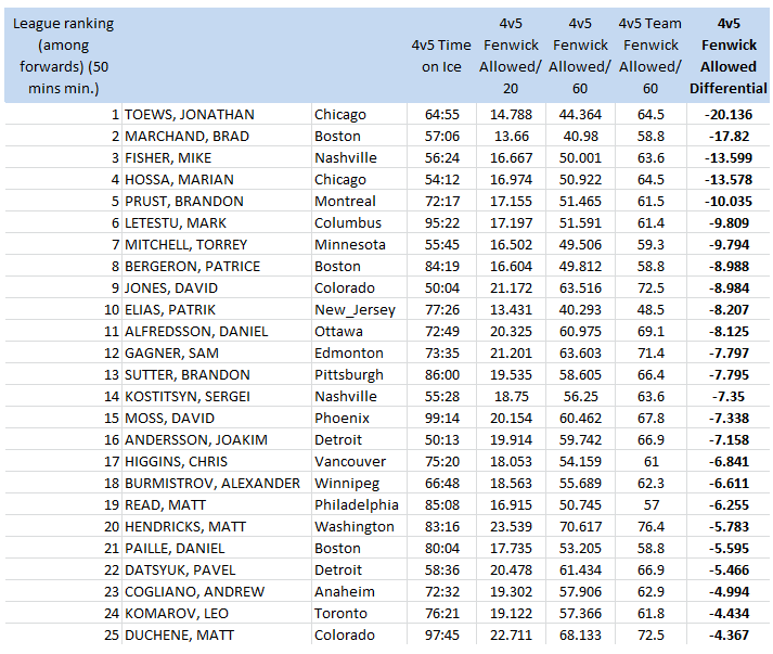 (Fenwick Against/60 mins measures unblocked shots against when a player is on the ice per 60 minutes of ice time.)