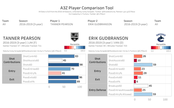 Above is a chart compiled by CJ Turtoro based on data tracked by Corey Sznajder that shows zone exit and entry rates measured in percentiles against the league average. Gudbranson is somewhat average in breaking up plays when attackers enter the Canucks zone, but he is in the sixth percentile for possession exit percentage and the 11th percentile for possession exits per 60 minutes.