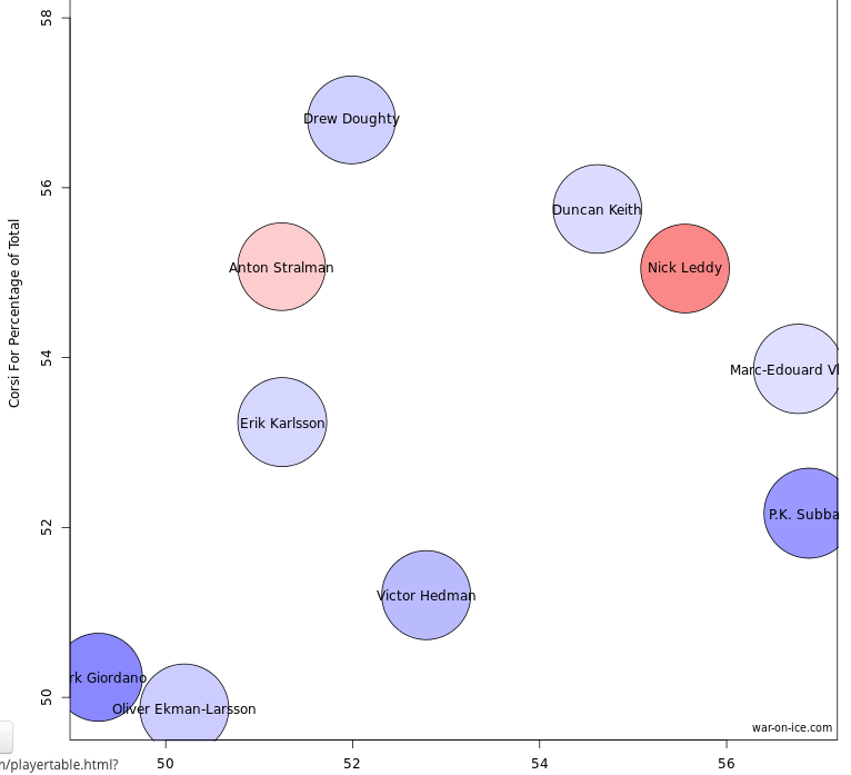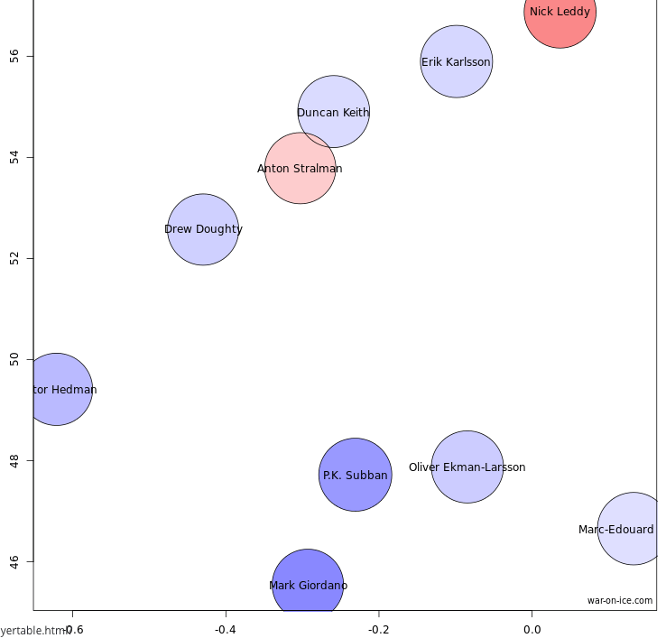 The size of a player’s dot shows their PDO, while the color of the dot indicates their competition’s corsi-for percentage. Basically, a redder dot means lighter competition while a bluer dot means tougher competition.