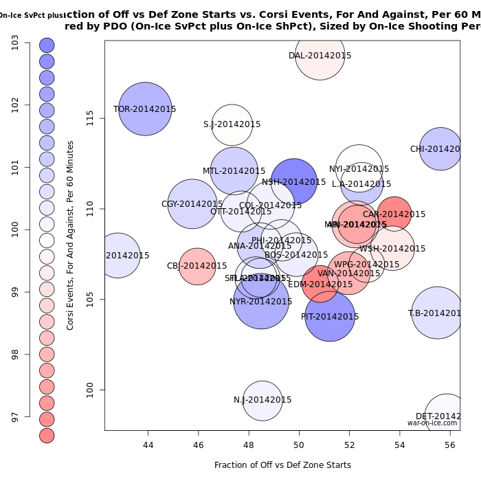 The X-axis variable is the fraction of offensive versus defensive zone starts, while the Y-variable is the Corsi for and against per 60 minutes. The color is based on the PDO, which is the on-ice save percentage versus the on-ice shooting percentage, and the size variable is the team’s shooting percentage.