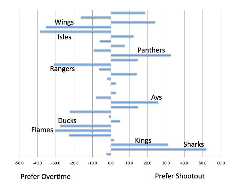 I’d suggest that any team between the dotted lines on the graphic is close to equal in both aspects, meaning they should not really care how the game is decided. 16 of 30 teams fit this criteria, a few others are barely outside the dotted lines. Only 11 teams are significantly outside the dotted lines. Interestingly, eight of the 11 are in the section that prefers overtime, only three are in the section that prefers the shootout.