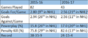 The graph shows a clear improvement in defensive play. From last year to this, they have improved on their goals against, power play, penalty kill and their overall record. The Senators’ special teams have especially benefited, and their success killing penalties is a good reason their GA/G has gone from 26th to 11th.