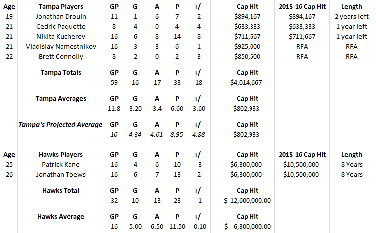 Looking at the five, and comparing them to superstars Patrick Kane and Jonathan Toews, you see that the Lightning youngsters are stacking up to the two pretty well on the score sheet, and extremely well on the pocketbook.